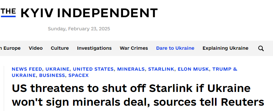 路透社21日独家浮现称开云(中国)Kaiyun·官方网站 - 登录入口,好意思国为进一步施压乌克兰交出要道矿产资源拓荒权,挟制要割断对乌克兰的“星链”卫星收集工作。尽管SpaceX首席扩充官马斯克22日否定了联系报说念,但在老司机看来,这事背后可不粗陋。 路透社的报说念称,开头好意思国谈判东说念主员向乌克兰施压,条件尽早签署对于乌克兰向好意思邦交出要道矿产资源拓荒权的左券,其中就波及削减乌克兰造访“星链”互联网卫星通讯工作的可能性。而后在好意思国政府乌克兰和俄罗斯问题特使基想·凯洛格与泽连斯基